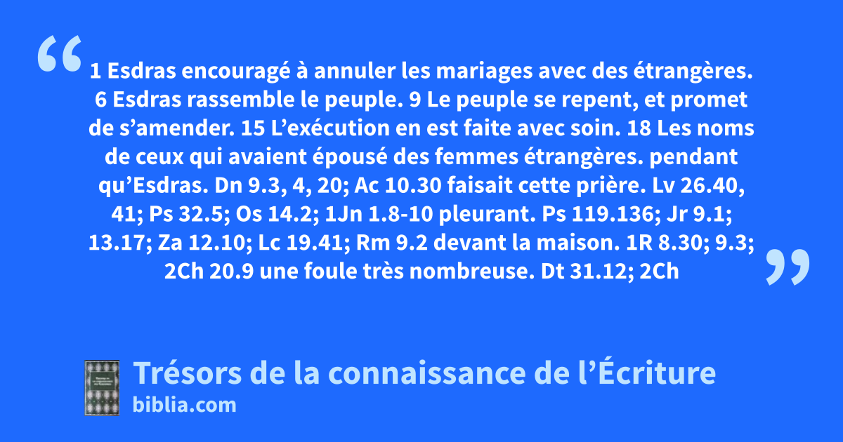 pendant qu’Esdras. Dn 9.3, 4, 20; Ac 10.30 faisait cette prière. Lv 26.40, 41; Ps 32.5; Os 14.2; 1Jn 1.8-10 pleurant. Ps 119.136; Jr 9.1; 13.17; Za 12.10; Lc 19.41; Rm 9.2 devant la maison. 1R 8.30; 9.3; 2Ch 20.9 une foule très nombreuse. Dt 31.12; 2Ch 20.13; Né 10.28; Jl 2.16-18; Ac 21.5 d’abondantes larmes. Jg 2.4, 5; Né 8.9