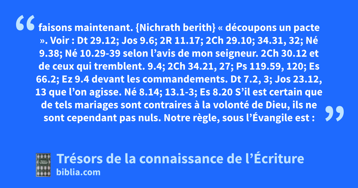 faisons maintenant. {Nichrath berith} « découpons un pacte ». Voir : Dt 29.12; Jos 9.6; 2R 11.17; 2Ch 29.10; 34.31, 32; Né 9.38; Né 10.29-39 selon l’avis de mon seigneur. 2Ch 30.12 et de ceux qui tremblent. 9.4; 2Ch 34.21, 27; Ps 119.59, 120; Es 66.2; Ez 9.4 devant les commandements. Dt 7.2, 3; Jos 23.12, 13 que l’on agisse. Né 8.14; 13.1-3; Es 8.20 S’il est certain que de tels mariages sont contraires à la volonté de Dieu, ils ne sont cependant pas nuls. Notre règle, sous l’Évangile est : {Quod fieri non debuit, factum valet} : « Lorsque ce qui ne devait pas être fait a été quand même fait, cela demeure ». Voir : 1Co 7.12, 13