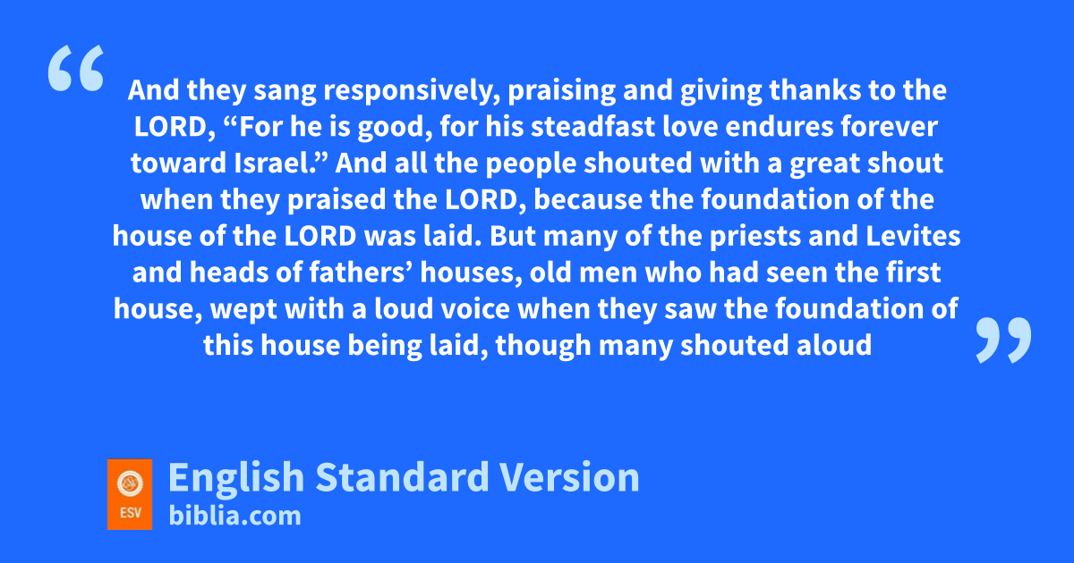 And all the people shouted with a great shout when they praised the Lord, because the foundation of the house of the Lord was laid. 12 But many of the priests and Levites and heads of fathers’ houses, fold men who had seen the first house, wept with a loud voice when they saw the foundation of this house being laid, though many shouted aloud for joy, 13 so that the people could not distinguish the sound of the joyful shout from the sound of the people’s weeping, for the people shouted with a great shout, and the sound was heard far away.