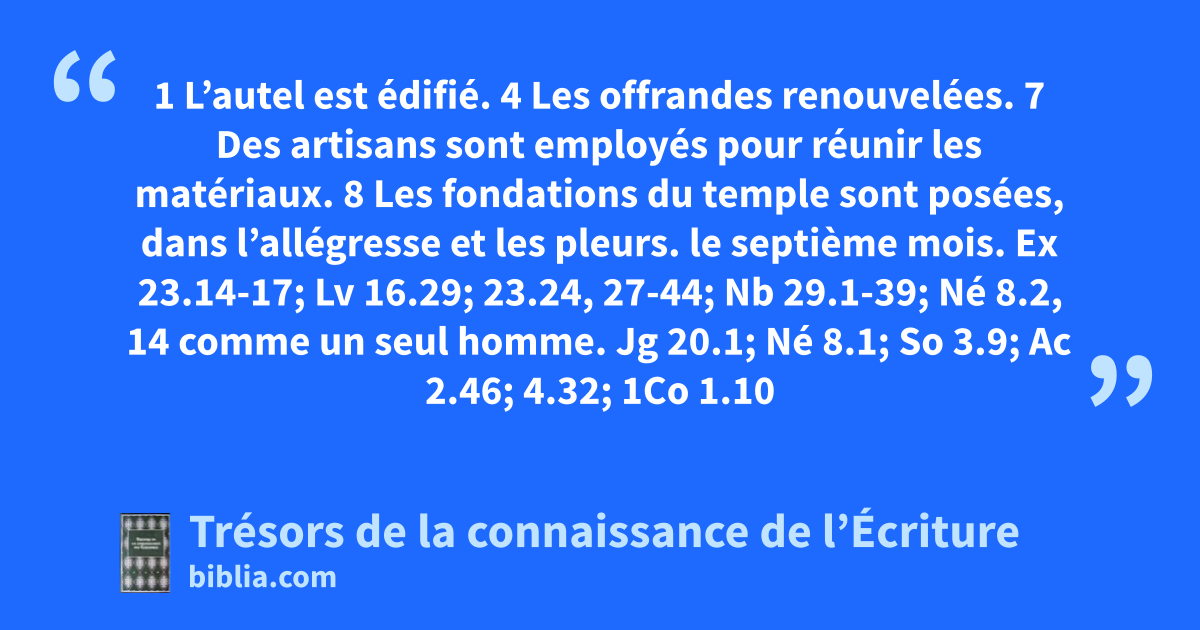 1 L’autel est édifié. 4 Les offrandes renouvelées. 7 Des artisans sont employés pour réunir les matériaux. 8 Les fondations du temple sont posées, dans l’allégresse et les pleurs.