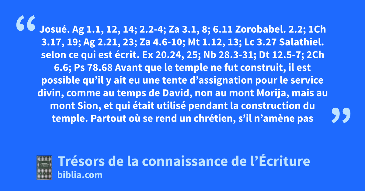 Josué. Ag 1.1, 12, 14; 2.2-4; Za 3.1, 8; 6.11 Zorobabel. 2.2; 1Ch 3.17, 19; Ag 2.21, 23; Za 4.6-10; Mt 1.12, 13; Lc 3.27 Salathiel. selon ce qui est écrit. Ex 20.24, 25; Nb 28.3-31; Dt 12.5-7; 2Ch 6.6; Ps 78.68 Avant que le temple ne fut construit, il est possible qu’il y ait eu une tente d’assignation pour le service divin, comme au temps de David, non au mont Morija, mais au mont Sion, et qui était utilisé pendant la construction du temple. Partout où se rend un chrétien, s’il n’amène pas avec lui les sacrifices de la prière et de la louange, il manque à son devoir. Il y a toujours un autel qui est prêt à sanctifier le don et le donateur.