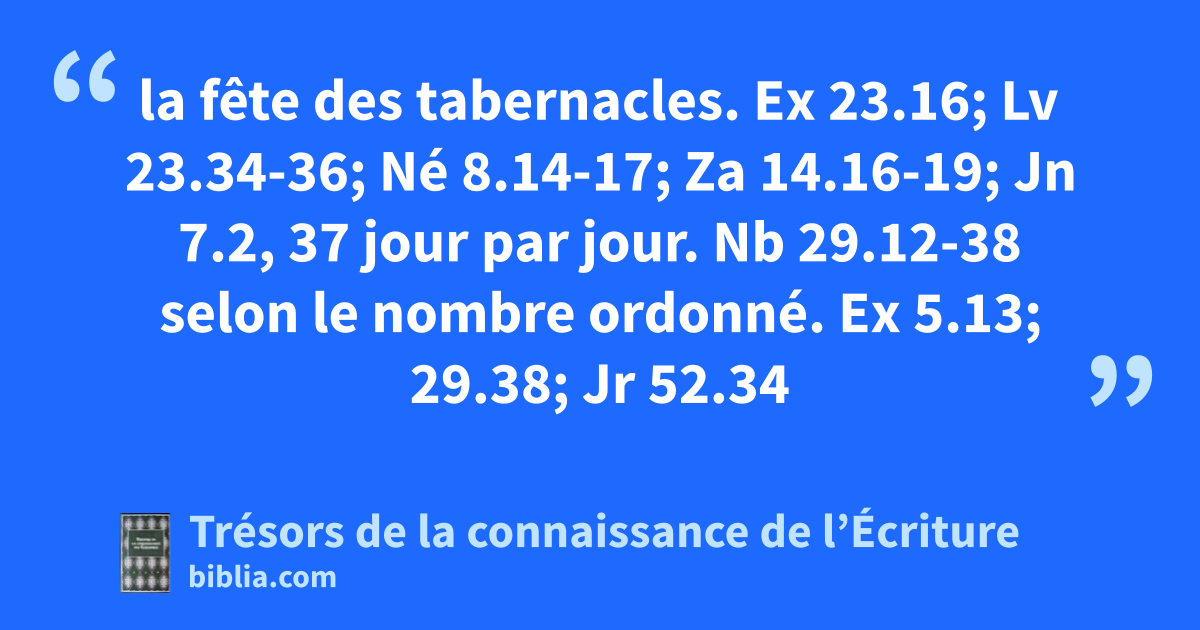 la fête des tabernacles. Ex 23.16; Lv 23.34-36; Né 8.14-17; Za 14.16-19; Jn 7.2, 37 jour par jour. Nb 29.12-38 selon le nombre ordonné. Ex 5.13; 29.38; Jr 52.34