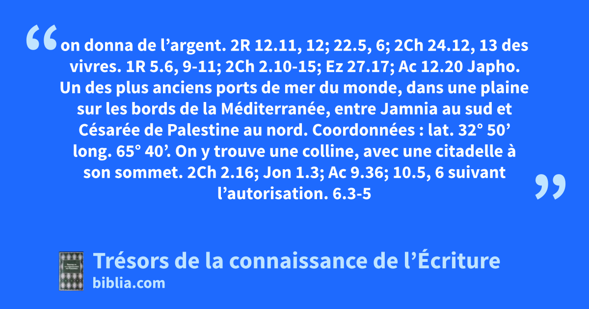 on donna de l’argent. 2R 12.11, 12; 22.5, 6; 2Ch 24.12, 13 des vivres. 1R 5.6, 9-11; 2Ch 2.10-15; Ez 27.17; Ac 12.20 Japho. Un des plus anciens ports de mer du monde, dans une plaine sur les bords de la Méditerranée, entre Jamnia au sud et Césarée de Palestine au nord. Coordonnées : lat. 32° 50’ long. 65° 40’. On y trouve une colline, avec une citadelle à son sommet. 2Ch 2.16; Jon 1.3; Ac 9.36; 10.5, 6 suivant l’autorisation. 6.3-5
