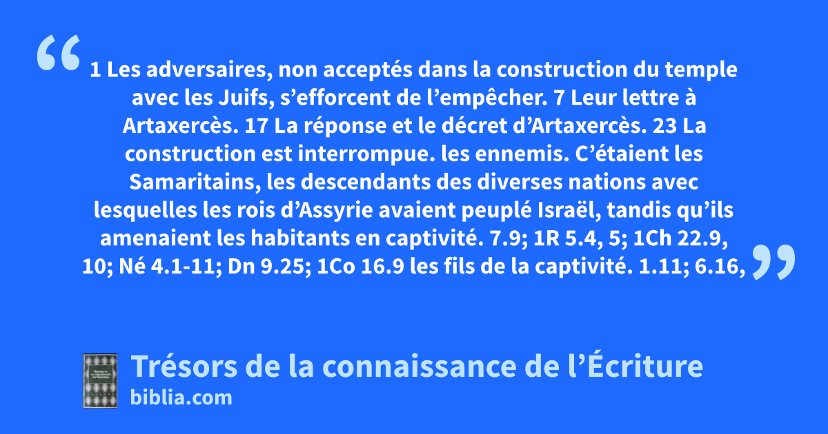 1 Les adversaires, non acceptés dans la construction du temple avec les Juifs, s’efforcent de l’empêcher. 7 Leur lettre à Artaxercès. 17 La réponse et le décret d’Artaxercès. 23 La construction est interrompue.