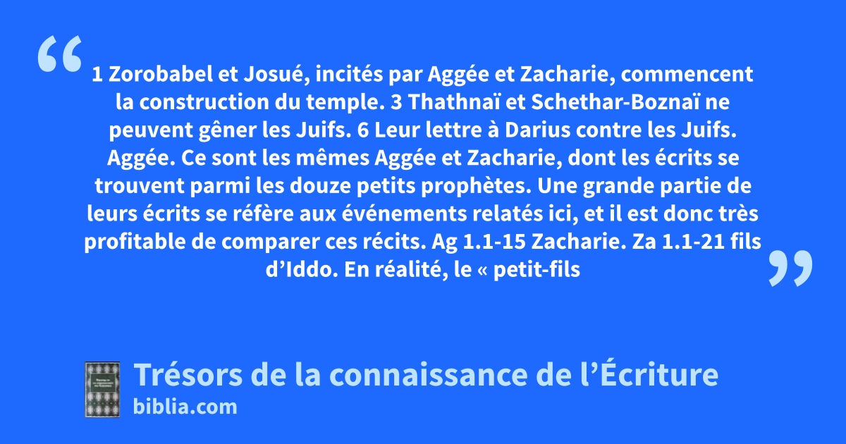 Aggée. Ce sont les mêmes Aggée et Zacharie, dont les écrits se trouvent parmi les douze petits prophètes. Une grande partie de leurs écrits se réfère aux événements relatés ici, et il est donc très profitable de comparer ces récits. Ag 1.1-15 Zacharie. Za 1.1-21 fils d’Iddo. En réalité, le « petit-fils d’Iddo », car Zacharie était fils de Bérékia, le fils d’Iddo. au nom du Dieu d’Israël. Mi 5.3; Ag 1.2-8; Za 1.3, 4; 4.6-10