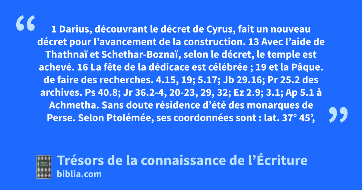 1 Darius, découvrant le décret de Cyrus, fait un nouveau décret pour l’avancement de la construction. 13 Avec l’aide de Thathnaï et Schethar-Boznaï, selon le décret, le temple est achevé.