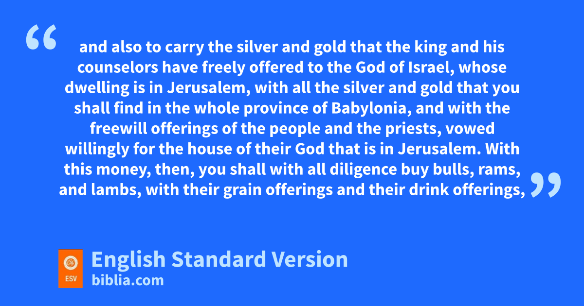 11 This is a copy of the letter that King Artaxerxes gave to Ezra the priest, the scribe, a man learned in matters of the commandments of the Lord and his statutes for Israel:2 12 “Artaxerxes, fking of kings, to Ezra the priest, the gscribe of the Law of the God of heaven. Peace.3 hAnd now 13 iI make a decree that anyone of the people of Israel or their priests or Levites in my kingdom, who freely offers to go to Jerusalem, may go with you. 14 For you are sent by the king jand his seven counselors to make inquiries about Judah and Jerusalem according to the Law of your God, which is in your hand, 15 and also to carry the silver and gold that the king jand his counselors have freely offered to the God of Israel, kwhose dwelling is in Jerusalem, 16 lwith all the silver and gold that you shall find in the whole province of Babylonia, and mwith the freewill offerings of the people and the priests, vowed willingly for the house of their God that is in Jerusalem. 17 With this money, then, you shall with all diligence buy bulls, rams, and lambs, with their grain offerings and their drink offerings, and nyou shall offer them on the altar of the house of your God that is in Jerusalem. 18 Whatever seems good to you and your brothers to do with the rest of the silver and gold, you may do, according to the will of your God. 19 The vessels that have been given you for the service of the house of your God, you shall deliver before the God of Jerusalem. 20 And whatever else is required for the house of your God, which it falls to you to provide, you may provide it out of the king’s treasury.