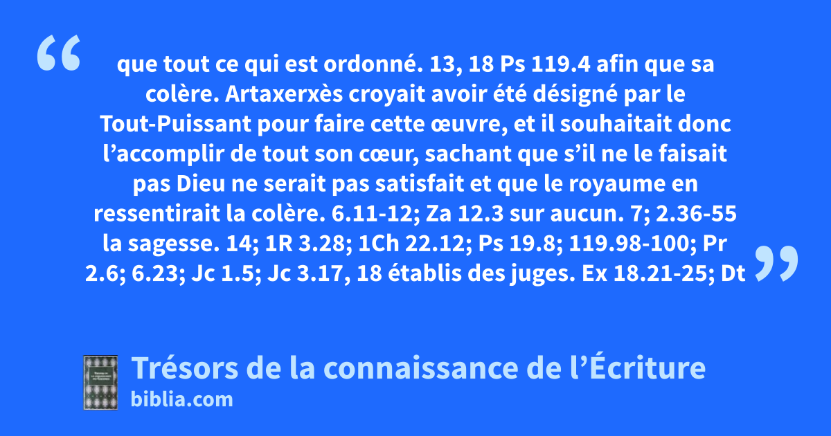 que tout ce qui est ordonné. 13, 18 Ps 119.4 afin que sa colère. Artaxerxès croyait avoir été désigné par le Tout-Puissant pour faire cette œuvre, et il souhaitait donc l’accomplir de tout son cœur, sachant que s’il ne le faisait pas Dieu ne serait pas satisfait et que le royaume en ressentirait la colère. 6.11-12; Za 12.3