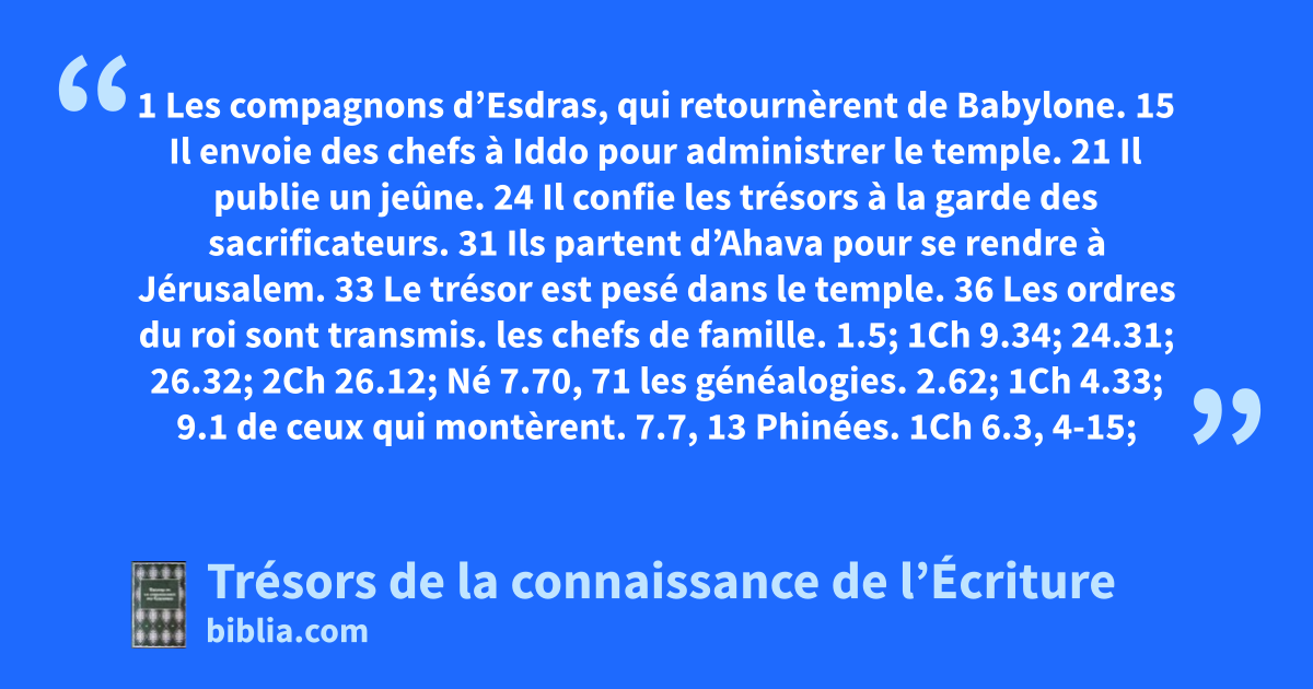 1 Les compagnons d’Esdras, qui retournèrent de Babylone. 15 Il envoie des chefs à Iddo pour administrer le temple. 21 Il publie un jeûne. 24 Il confie les trésors à la garde des sacrificateurs. 31 Ils partent d’Ahava pour se rendre à Jérusalem. 33 Le trésor est pesé dans le temple. 36 Les ordres du roi sont transmis.