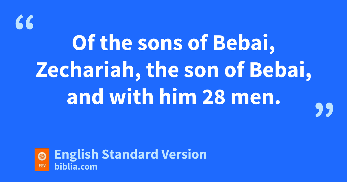 8 These are the heads of their fathers’ houses, and this is the genealogy of those who went up with me from Babylonia, in the reign of Artaxerxes the king: 2 Of the sons of Phinehas, Gershom. Of the sons of uIthamar, Daniel. Of the sons of David, vHattush. 3 Of the sons of Shecaniah, who was of the sons of wParosh, Zechariah, with whom were registered 150 men. 4 xOf the sons of Pahath-moab, Eliehoenai the son of Zerahiah, and with him 200 men. 5 Of the sons of Zattu,1 Shecaniah the son of Jahaziel, and with him 300 men. 6 Of the sons of Adin, Ebed the son of Jonathan, and with him 50 men. 7 Of the sons of Elam, Jeshaiah the son of Athaliah, and with him 70 men. 8 Of the sons of Shephatiah, Zebadiah the son of Michael, and with him 80 men. 9 Of the sons of Joab, Obadiah the son of Jehiel, and with him 218 men. 10 Of the sons of Bani,2 Shelomith the son of Josiphiah, and with him 160 men. 11 yOf the sons of Bebai, Zechariah, the son of Bebai, and with him 28 men. 12 Of the sons of Azgad, Johanan the son of Hakkatan, and with him 110 men. 13 Of the sons of Adonikam, those who came later, their names being Eliphelet, Jeuel, and Shemaiah, and with them 60 men. 14 Of the sons of Bigvai, Uthai and Zaccur, and with them 70 men.