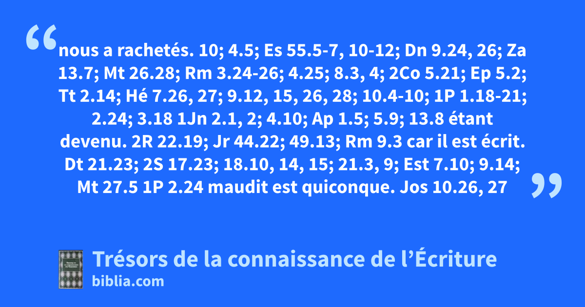 nous a rachetés. 10; 4.5; Es 55.5-7, 10-12; Dn 9.24, 26; Za 13.7; Mt 26.28; Rm 3.24-26; 4.25; 8.3, 4; 2Co 5.21; Ep 5.2; Tt 2.14; Hé 7.26, 27; 9.12, 15, 26, 28; 10.4-10; 1P 1.18-21; 2.24; 3.18 1Jn 2.1, 2; 4.10; Ap 1.5; 5.9; 13.8 étant devenu. 2R 22.19; Jr 44.22; 49.13; Rm 9.3 car il est écrit. Dt 21.23; 2S 17.23; 18.10, 14, 15; 21.3, 9; Est 7.10; 9.14; Mt 27.5 1P 2.24 maudit est quiconque. Jos 10.26, 27
