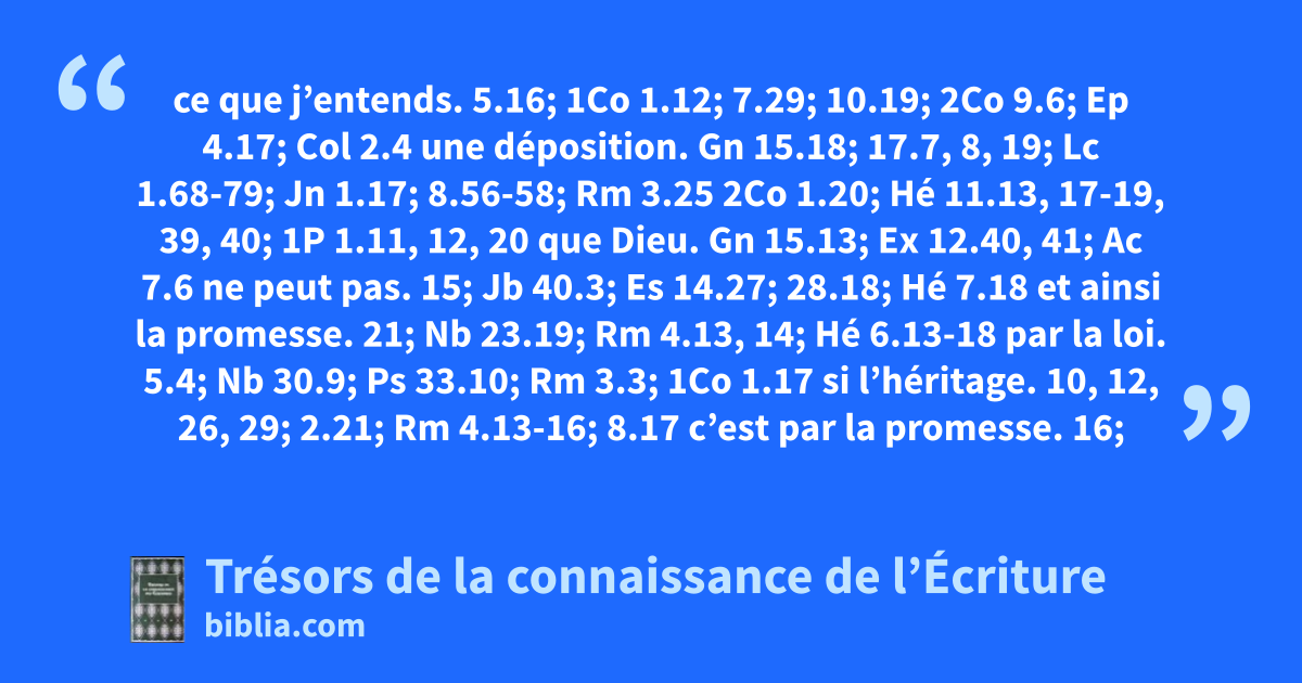 ce que j’entends. 5.16; 1Co 1.12; 7.29; 10.19; 2Co 9.6; Ep 4.17; Col 2.4 une déposition. Gn 15.18; 17.7, 8, 19; Lc 1.68-79; Jn 1.17; 8.56-58; Rm 3.25 2Co 1.20; Hé 11.13, 17-19, 39, 40; 1P 1.11, 12, 20 que Dieu. Gn 15.13; Ex 12.40, 41; Ac 7.6 ne peut pas. 15; Jb 40.3; Es 14.27; 28.18; Hé 7.18 et ainsi la promesse. 21; Nb 23.19; Rm 4.13, 14; Hé 6.13-18 par la loi. 5.4; Nb 30.9; Ps 33.10; Rm 3.3; 1Co 1.17