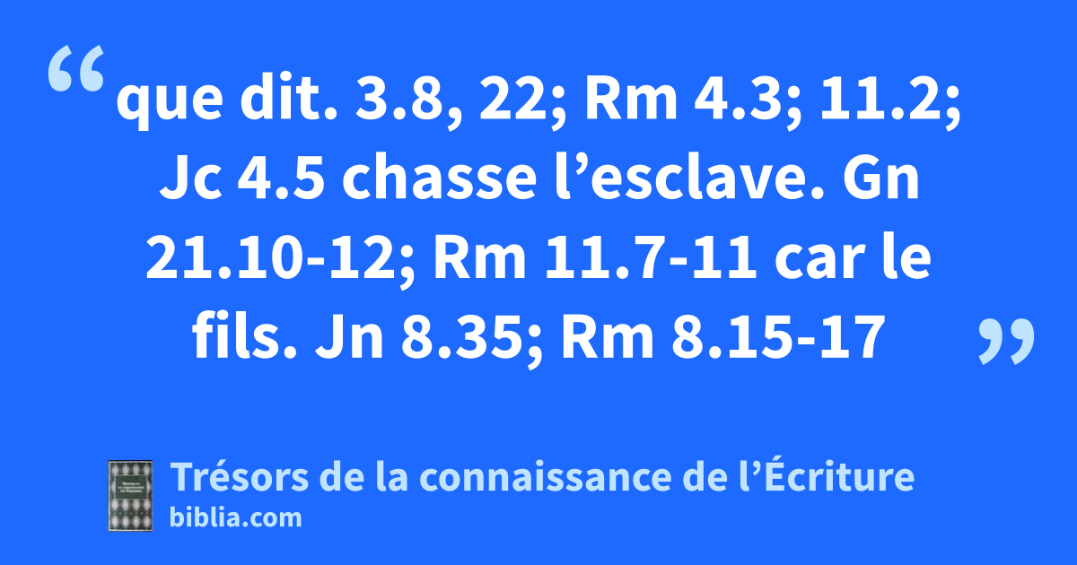 que dit. 3.8, 22; Rm 4.3; 11.2; Jc 4.5 chasse l’esclave. Gn 21.10-12; Rm 11.7-11 car le fils. Jn 8.35; Rm 8.15-17