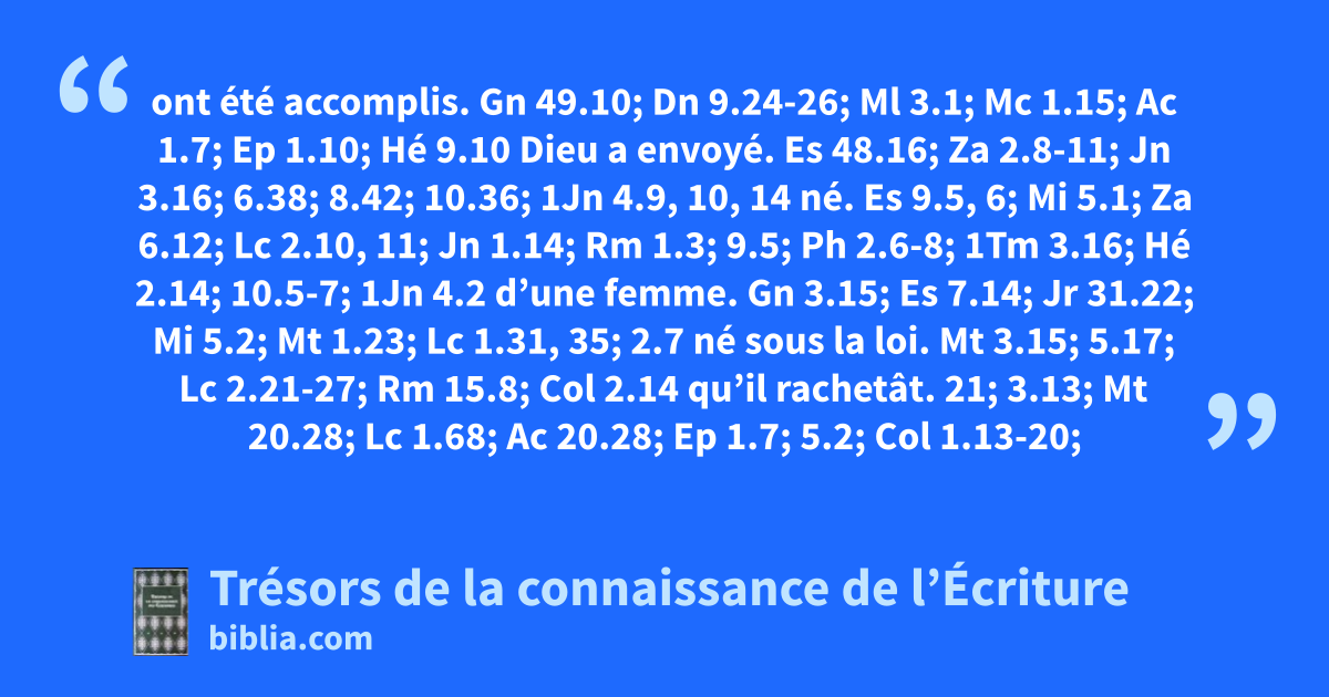ont été accomplis. Gn 49.10; Dn 9.24-26; Ml 3.1; Mc 1.15; Ac 1.7; Ep 1.10; Hé 9.10 Dieu a envoyé. Es 48.16; Za 2.8-11; Jn 3.16; 6.38; 8.42; 10.36; 1Jn 4.9, 10, 14 né. Es 9.5, 6; Mi 5.1; Za 6.12; Lc 2.10, 11; Jn 1.14; Rm 1.3; 9.5; Ph 2.6-8; 1Tm 3.16; Hé 2.14; 10.5-7; 1Jn 4.2 d’une femme. Gn 3.15; Es 7.14; Jr 31.22; Mi 5.2; Mt 1.23; Lc 1.31, 35; 2.7 né sous la loi. Mt 3.15; 5.17; Lc 2.21-27; Rm 15.8; Col 2.14