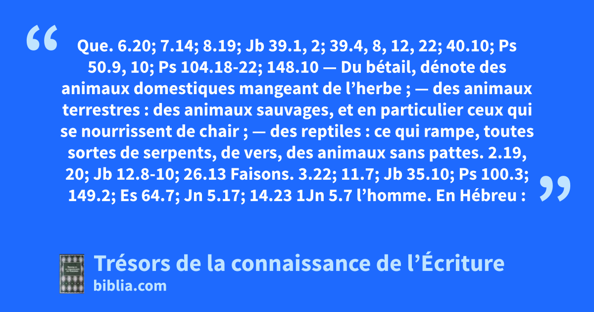 Que. 6.20; 7.14; 8.19; Jb 39.1, 2; 39.4, 8, 12, 22; 40.10; Ps 50.9, 10; Ps 104.18-22; 148.10 — Du bétail, dénote des animaux domestiques mangeant de l’herbe ; — des animaux terrestres : des animaux sauvages, et en particulier ceux qui se nourrissent de chair ; — des reptiles : ce qui rampe, toutes sortes de serpents, de vers, des animaux sans pattes.