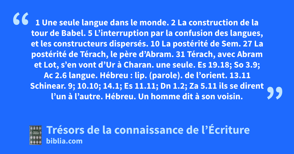 1 Une seule langue dans le monde. 2 La construction de la tour de Babel. 5 L’interruption par la confusion des langues, et les constructeurs dispersés. 10 La postérité de Sem. 27 La postérité de Térach, le père d’Abram. 31 Térach, avec Abram et Lot, s’en vont d’Ur à Charan.