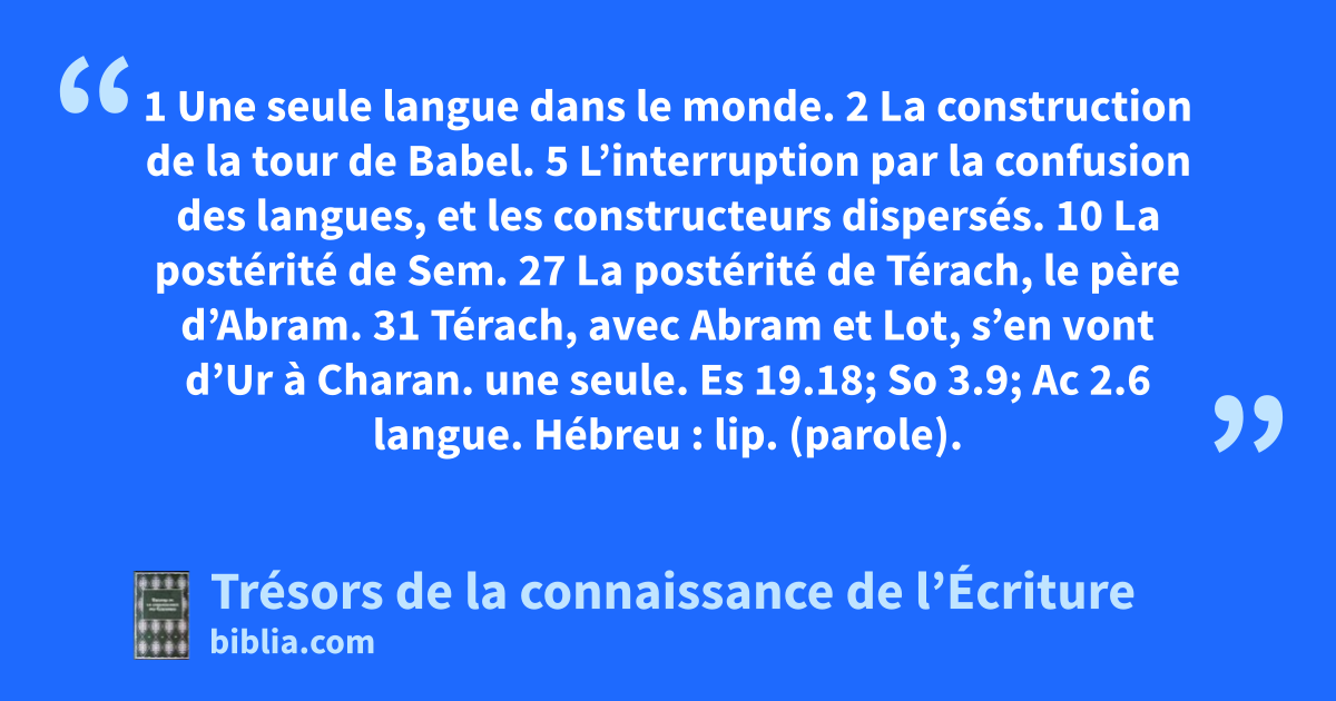 1 Une seule langue dans le monde. 2 La construction de la tour de Babel. 5 L’interruption par la confusion des langues, et les constructeurs dispersés. 10 La postérité de Sem. 27 La postérité de Térach, le père d’Abram. 31 Térach, avec Abram et Lot, s’en vont d’Ur à Charan.