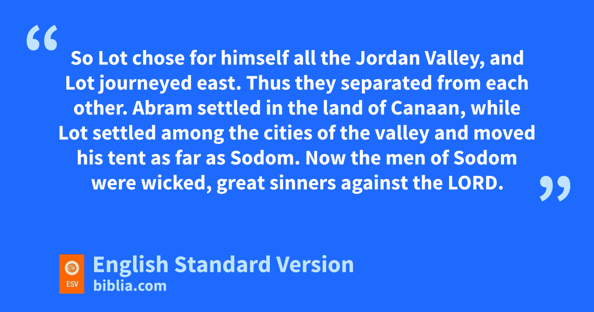 8 Then Abram said to Lot, g“Let there be no strife between you and me, and between your herdsmen and my herdsmen, hfor we are kinsmen.1 9 iIs not the whole land before you? Separate yourself from me. If you take the left hand, then I will go to the right, or if you take the right hand, then I will go to the left.” 10 And Lot lifted up his eyes and saw that the jJordan Valley was well watered everywhere like kthe garden of the Lord, like the land of Egypt, in the direction of lZoar. (This was before the Lord mdestroyed Sodom and Gomorrah.) 11 So Lot chose for himself all the Jordan Valley, and Lot journeyed east. Thus they separated from each other. 12 Abram settled in the land of Canaan, while Lot settled among the cities of the valley and moved his tent as far as Sodom. 13 Now the men of Sodom nwere wicked, great sinners against the Lord.