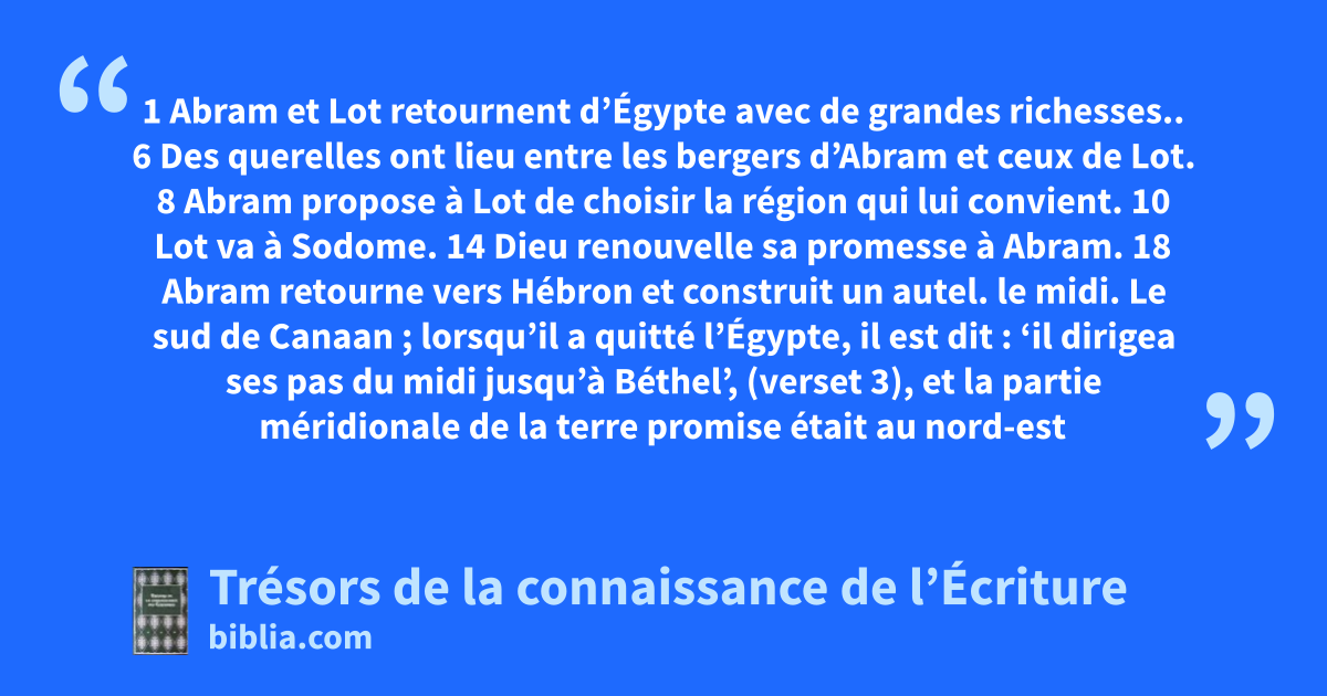 1 Abram et Lot retournent d’Égypte avec de grandes richesses.. 6 Des querelles ont lieu entre les bergers d’Abram et ceux de Lot. 8 Abram propose à Lot de choisir la région qui lui convient. 10 Lot va à Sodome. 14 Dieu renouvelle sa promesse à Abram. 18 Abram retourne vers Hébron et construit un autel.