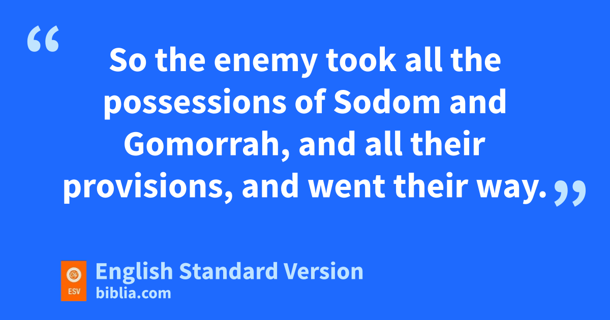 8 Then the king of Sodom, the king of Gomorrah, the king of Admah, the king of Zeboiim, and the king of Bela (that is, Zoar) went out, and they joined battle in the Valley of Siddim 9 with Chedorlaomer king of Elam, Tidal king of Goiim, Amraphel king of Shinar, and Arioch king of Ellasar, four kings against five. 10 Now the Valley of Siddim was full of ibitumen pits, and as the kings of Sodom and Gomorrah fled, some fell into them, and the rest fled jto the hill country. 11 So the enemy took kall the possessions of Sodom and Gomorrah, and all their provisions, and went their way. 12 They also took Lot, lthe son of Abram’s brother, mwho was dwelling in Sodom, and his possessions, and went their way.