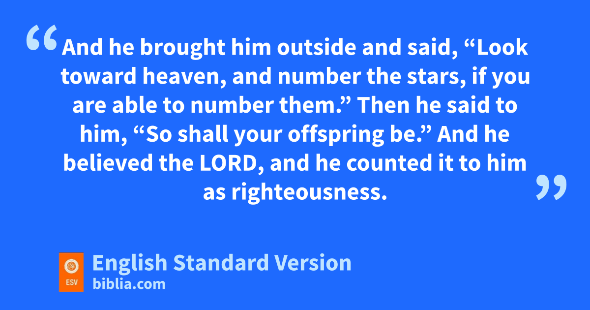 15 After these things the word of the Lord came to Abram in a vision: c“Fear not, Abram, I am dyour shield; your reward shall be very great.” 2 But Abram said, “O Lord God, what will you give me, for I continue1 childless, and the heir of my house is Eliezer of Damascus?” 3 And Abram said, “Behold, you have given me no offspring, and ea member of my household will be my heir.” 4 And behold, the word of the Lord came to him: “This man shall not be your heir; fyour very own son2 shall be your heir.” 5 And he brought him outside and said, “Look toward heaven, and gnumber the stars, if you are able to number them.” Then he said to him, h“So shall your offspring be.” 6 And ihe believed the Lord, and jhe counted it to him as righteousness.