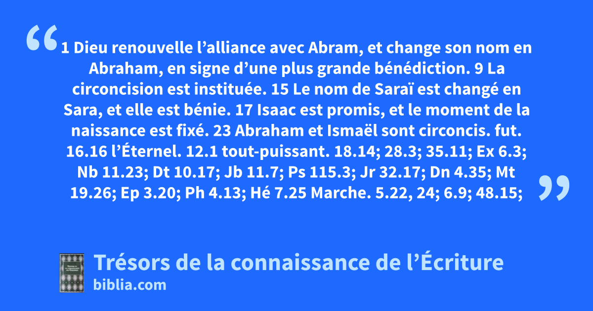 1 Dieu renouvelle l’alliance avec Abram, et change son nom en Abraham, en signe d’une plus grande bénédiction. 9 La circoncision est instituée. 15 Le nom de Saraï est changé en Sara, et elle est bénie. 17 Isaac est promis, et le moment de la naissance est fixé. 23 Abraham et Ismaël sont circoncis.
