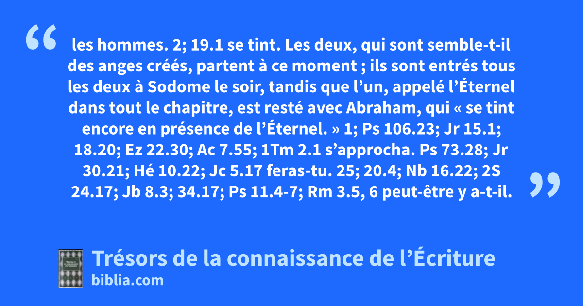 les hommes. 2; 19.1 se tint. Les deux, qui sont semble-t-il des anges créés, partent à ce moment ; ils sont entrés tous les deux à Sodome le soir, tandis que l’un, appelé l’Éternel dans tout le chapitre, est resté avec Abraham, qui « se tint encore en présence de l’Éternel. » 1; Ps 106.23; Jr 15.1; 18.20; Ez 22.30; Ac 7.55; 1Tm 2.1