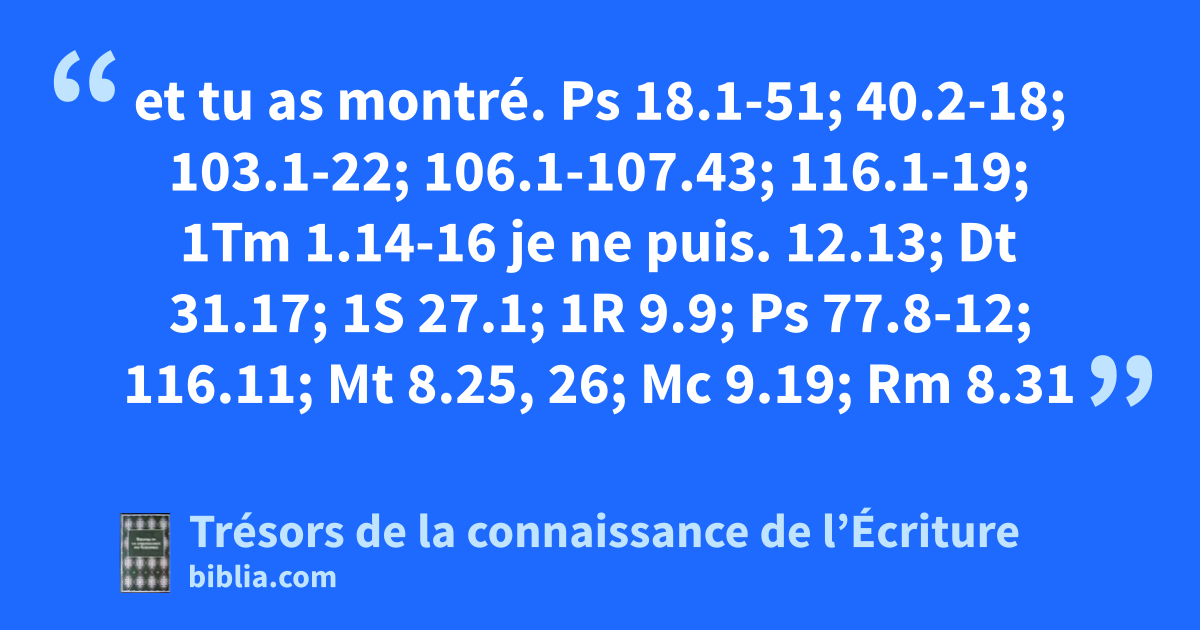 et tu as montré. Ps 18.1-51; 40.2-18; 103.1-22; 106.1-107.43; 116.1-19; 1Tm 1.14-16 je ne puis. 12.13; Dt 31.17; 1S 27.1; 1R 9.9; Ps 77.8-12; 116.11; Mt 8.25, 26; Mc 9.19; Rm 8.31