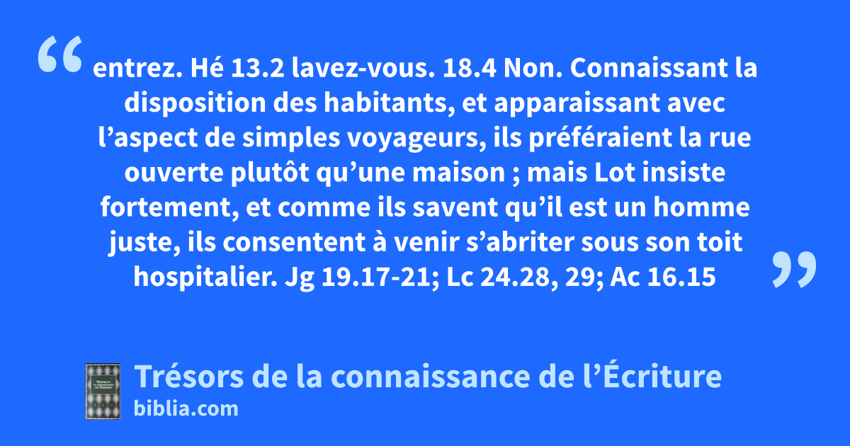 entrez. Hé 13.2 lavez-vous. 18.4 Non. Connaissant la disposition des habitants, et apparaissant avec l’aspect de simples voyageurs, ils préféraient la rue ouverte plutôt qu’une maison ; mais Lot insiste fortement, et comme ils savent qu’il est un homme juste, ils consentent à venir s’abriter sous son toit hospitalier. Jg 19.17-21; Lc 24.28, 29; Ac 16.15