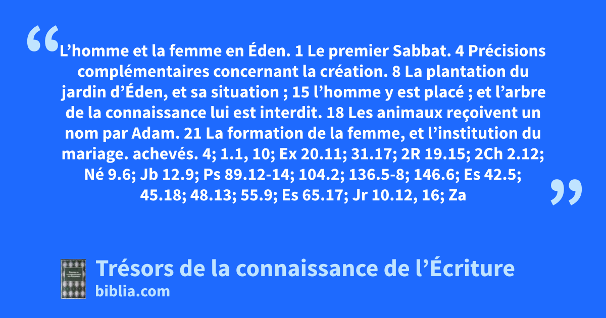 1 Le premier Sabbat. 4 Précisions complémentaires concernant la création. 8 La plantation du jardin d’Éden, et sa situation ; 15 l’homme y est placé ; et l’arbre de la connaissance lui est interdit. 18 Les animaux reçoivent un nom par Adam. 21 La formation de la femme, et l’institution du mariage.