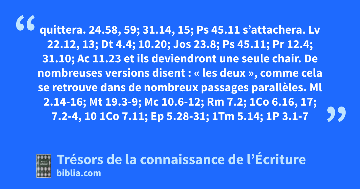 quittera. 24.58, 59; 31.14, 15; Ps 45.11 s’attachera. Lv 22.12, 13; Dt 4.4; 10.20; Jos 23.8; Ps 45.11; Pr 12.4; 31.10; Ac 11.23 et ils deviendront une seule chair. De nombreuses versions disent : « les deux », comme cela se retrouve dans de nombreux passages parallèles. Ml 2.14-16; Mt 19.3-9; Mc 10.6-12; Rm 7.2; 1Co 6.16, 17; 7.2-4, 10 1Co 7.11; Ep 5.28-31; 1Tm 5.14; 1P 3.1-7