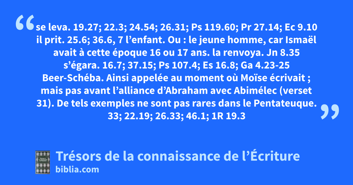 se leva. 19.27; 22.3; 24.54; 26.31; Ps 119.60; Pr 27.14; Ec 9.10 il prit. 25.6; 36.6, 7 l’enfant. Ou : le jeune homme, car Ismaël avait à cette époque 16 ou 17 ans. la renvoya. Jn 8.35 s’égara. 16.7; 37.15; Ps 107.4; Es 16.8; Ga 4.23-25 Beer-Schéba. Ainsi appelée au moment où Moïse écrivait ; mais pas avant l’alliance d’Abraham avec Abimélec (verset 31). De tels exemples ne sont pas rares dans le Pentateuque. 33; 22.19; 26.33; 46.1; 1R 19.3