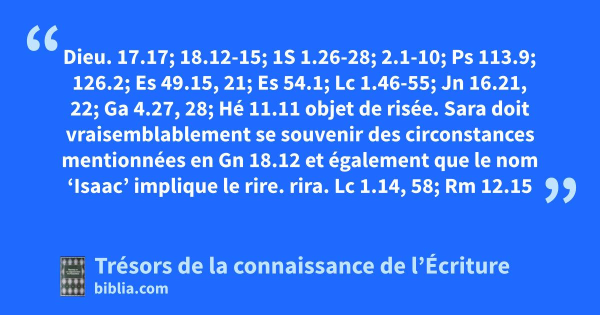 Dieu. 17.17; 18.12-15; 1S 1.26-28; 2.1-10; Ps 113.9; 126.2; Es 49.15, 21; Es 54.1; Lc 1.46-55; Jn 16.21, 22; Ga 4.27, 28; Hé 11.11 objet de risée. Sara doit vraisemblablement se souvenir des circonstances mentionnées en Gn 18.12 et également que le nom ‘Isaac’ implique le rire. rira. Lc 1.14, 58; Rm 12.15