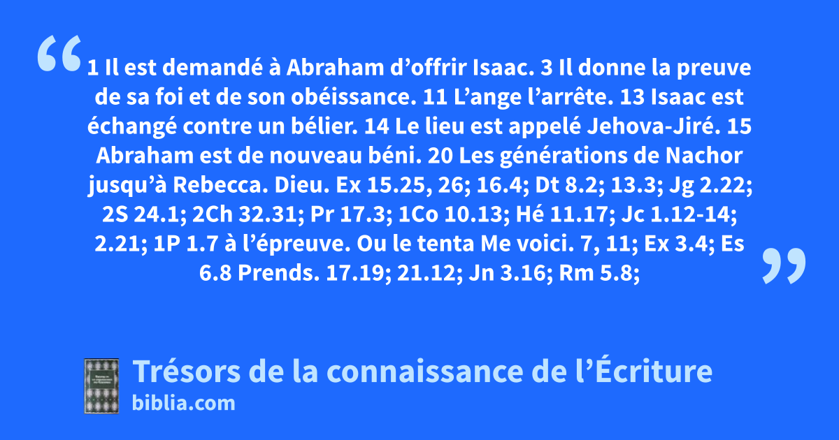 1 Il est demandé à Abraham d’offrir Isaac. 3 Il donne la preuve de sa foi et de son obéissance. 11 L’ange l’arrête. 13 Isaac est échangé contre un bélier. 14 Le lieu est appelé Jehova-Jiré. 15 Abraham est de nouveau béni. 20 Les générations de Nachor jusqu’à Rebecca.
