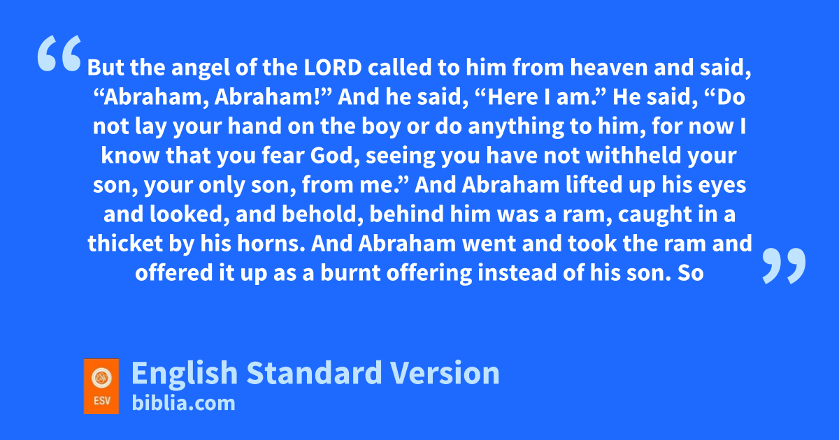 9 When they came to the place of which God had told him, Abraham built the altar there and laid the wood in order and bound Isaac his son and olaid him on the altar, on top of the wood. 10 Then Abraham reached out his hand and took the knife to slaughter his son. 11 But the angel of the Lord called to him from heaven and said, “Abraham, Abraham!” And he said, “Here I am.” 12 He said, p“Do not lay your hand on the boy or do anything to him, for qnow I know that you fear God, seeing you have not withheld your son, your only son, from me.” 13 And Abraham lifted up his eyes and looked, and behold, behind him was a ram, caught in a thicket by his horns. And Abraham went and took the ram and offered it up as a burnt offering instead of his son. 14 So Abraham called the name of that place, r“The Lord will provide”;2 as it is said to this day, “On the mount of the Lord it shall be provided.”3