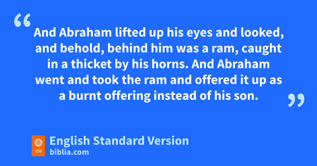 9 When they came to the place of which God had told him, Abraham built the altar there and laid the wood in order and bound Isaac his son and olaid him on the altar, on top of the wood. 10 Then Abraham reached out his hand and took the knife to slaughter his son. 11 But the angel of the Lord called to him from heaven and said, “Abraham, Abraham!” And he said, “Here I am.” 12 He said, p“Do not lay your hand on the boy or do anything to him, for qnow I know that you fear God, seeing you have not withheld your son, your only son, from me.” 13 And Abraham lifted up his eyes and looked, and behold, behind him was a ram, caught in a thicket by his horns. And Abraham went and took the ram and offered it up as a burnt offering instead of his son. 14 So Abraham called the name of that place, r“The Lord will provide”;2 as it is said to this day, “On the mount of the Lord it shall be provided.”3