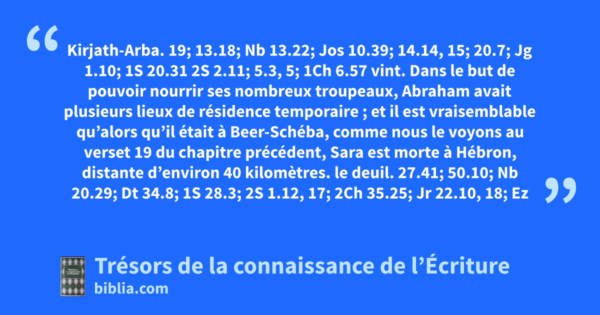 Kirjath-Arba. 19; 13.18; Nb 13.22; Jos 10.39; 14.14, 15; 20.7; Jg 1.10; 1S 20.31 2S 2.11; 5.3, 5; 1Ch 6.57 vint. Dans le but de pouvoir nourrir ses nombreux troupeaux, Abraham avait plusieurs lieux de résidence temporaire ; et il est vraisemblable qu’alors qu’il était à Beer-Schéba, comme nous le voyons au verset 19 du chapitre précédent, Sara est morte à Hébron, distante d’environ 40 kilomètres. le deuil. 27.41; 50.10; Nb 20.29; Dt 34.8; 1S 28.3; 2S 1.12, 17; 2Ch 35.25; Jr 22.10, 18; Ez 24.16-18; Jn 11.31, 35; Ac 8.2