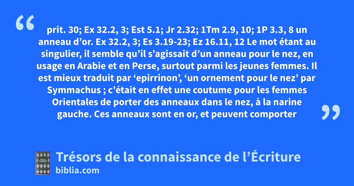 prit. 30; Ex 32.2, 3; Est 5.1; Jr 2.32; 1Tm 2.9, 10; 1P 3.3, 8 un anneau d’or. Ex 32.2, 3; Es 3.19-23; Ez 16.11, 12 Le mot étant au singulier, il semble qu’il s’agissait d’un anneau pour le nez, en usage en Arabie et en Perse, surtout parmi les jeunes femmes. Il est mieux traduit par ‘epirrinon’, ‘un ornement pour le nez’ par Symmachus ; c’était en effet une coutume pour les femmes Orientales de porter des anneaux dans le nez, à la narine gauche. Ces anneaux sont en or, et peuvent comporter perles ou rubis. d’un demi. 23.15, 16 bracelets. Le mot traduit par ‘bracelet', selon une racine signifiant ‘joindre’ ou « accoupler », peut désigner des bijoux pour les bras, mais également pour les chevilles.