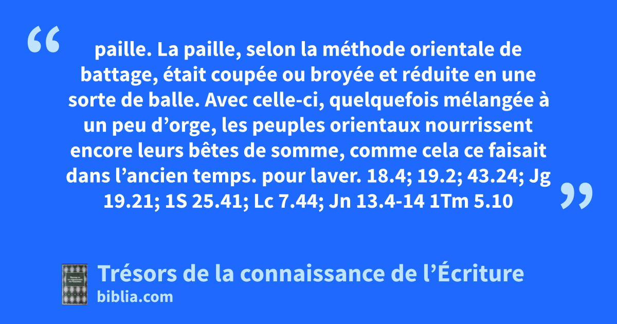 paille. La paille, selon la méthode orientale de battage, était coupée ou broyée et réduite en une sorte de balle. Avec celle-ci, quelquefois mélangée à un peu d’orge, les peuples orientaux nourrissent encore leurs bêtes de somme, comme cela ce faisait dans l’ancien temps. pour laver. 18.4; 19.2; 43.24; Jg 19.21; 1S 25.41; Lc 7.44; Jn 13.4-14 1Tm 5.10