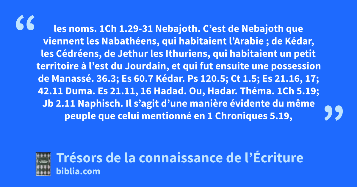les noms. 1Ch 1.29-31 Nebajoth. C’est de Nebajoth que viennent les Nabathéens, qui habitaient l’Arabie ; de Kédar, les Cédréens, de Jethur les Ithuriens, qui habitaient un petit territoire à l’est du Jourdain, et qui fut ensuite une possession de Manassé. 36.3; Es 60.7 Kédar. Ps 120.5; Ct 1.5; Es 21.16, 17; 42.11