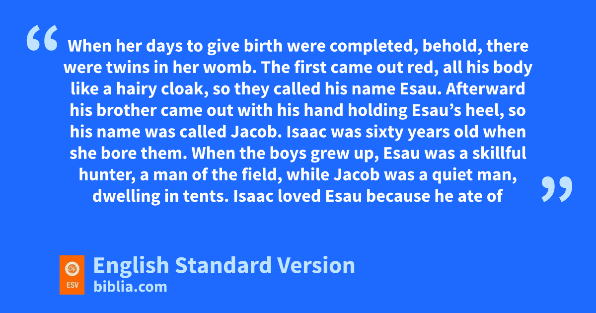 24 When her days to give birth were completed, behold, there were twins in her womb. 25 The first came out red, nall his body like a hairy cloak, so they called his name Esau. 26 Afterward his brother came out with ohis hand holding Esau’s heel, so phis name was called Jacob.4 Isaac was sixty years old when she bore them.