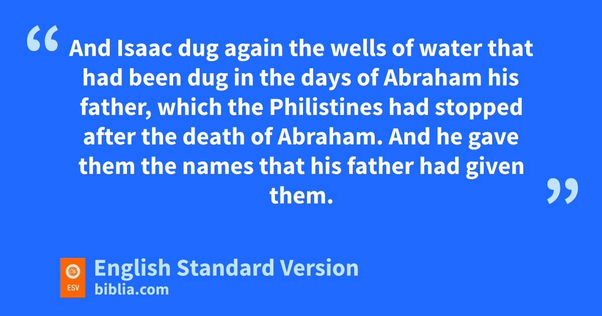 17 So Isaac departed from there and encamped in the Valley of Gerar and settled there. 18 And Isaac dug again the wells of water that had been dug in the days of Abraham his father, which the Philistines had stopped after the death of Abraham. And mhe gave them the names that his father had given them. 19 But when Isaac’s servants dug in the valley and found there a well of spring water, 20 the herdsmen of Gerar nquarreled with Isaac’s herdsmen, saying, “The water is ours.” So he called the name of the well Esek,2 because they contended with him. 21 Then they dug another well, and they quarreled over that also, so he called its name Sitnah.3 22 And he moved from there and dug another well, and they did not quarrel over it. So he called its name Rehoboth,4 saying, “For now the Lord has made room for us, and we shall be fruitful in the land.”