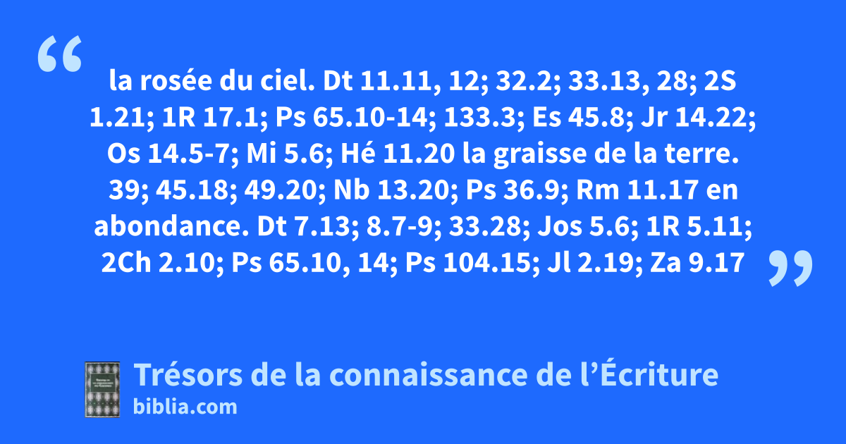 la rosée du ciel. Dt 11.11, 12; 32.2; 33.13, 28; 2S 1.21; 1R 17.1; Ps 65.10-14; 133.3; Es 45.8; Jr 14.22; Os 14.5-7; Mi 5.6; Hé 11.20 la graisse de la terre. 39; 45.18; 49.20; Nb 13.20; Ps 36.9; Rm 11.17 en abondance. Dt 7.13; 8.7-9; 33.28; Jos 5.6; 1R 5.11; 2Ch 2.10; Ps 65.10, 14; Ps 104.15; Jl 2.19; Za 9.17