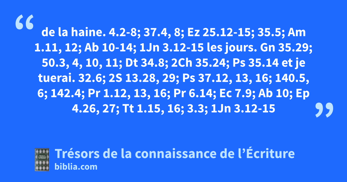 de la haine. 4.2-8; 37.4, 8; Ez 25.12-15; 35.5; Am 1.11, 12; Ab 10-14; 1Jn 3.12-15 les jours. Gn 35.29; 50.3, 4, 10, 11; Dt 34.8; 2Ch 35.24; Ps 35.14 et je tuerai. 32.6; 2S 13.28, 29; Ps 37.12, 13, 16; 140.5, 6; 142.4; Pr 1.12, 13, 16; Pr 6.14; Ec 7.9; Ab 10; Ep 4.26, 27; Tt 1.15, 16; 3.3; 1Jn 3.12-15