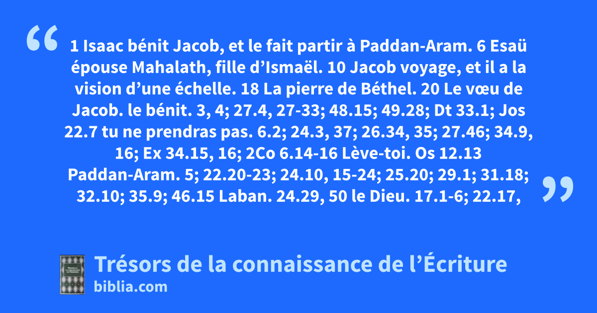 1 Isaac bénit Jacob, et le fait partir à Paddan-Aram. 6 Esaü épouse Mahalath, fille d’Ismaël. 10 Jacob voyage, et il a la vision d’une échelle. 18 La pierre de Béthel. 20 Le vœu de Jacob.