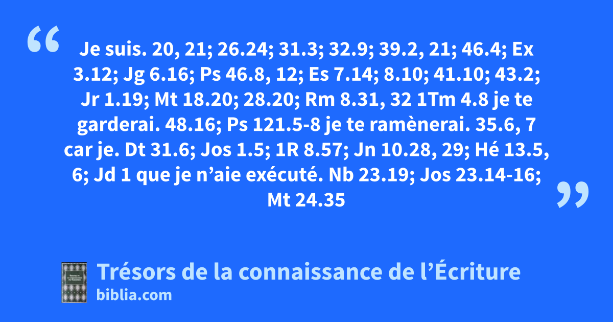 Je suis. 20, 21; 26.24; 31.3; 32.9; 39.2, 21; 46.4; Ex 3.12; Jg 6.16; Ps 46.8, 12; Es 7.14; 8.10; 41.10; 43.2; Jr 1.19; Mt 18.20; 28.20; Rm 8.31, 32 1Tm 4.8 je te garderai. 48.16; Ps 121.5-8 je te ramènerai. 35.6, 7 car je. Dt 31.6; Jos 1.5; 1R 8.57; Jn 10.28, 29; Hé 13.5, 6; Jd 1 que je n’aie exécuté. Nb 23.19; Jos 23.14-16; Mt 24.35