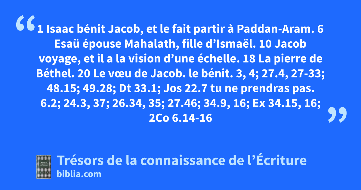 1 Isaac bénit Jacob, et le fait partir à Paddan-Aram. 6 Esaü épouse Mahalath, fille d’Ismaël. 10 Jacob voyage, et il a la vision d’une échelle. 18 La pierre de Béthel. 20 Le vœu de Jacob.