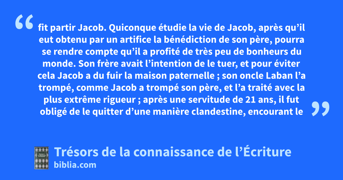 fit partir Jacob. Quiconque étudie la vie de Jacob, après qu’il eut obtenu par un artifice la bénédiction de son père, pourra se rendre compte qu’il a profité de très peu de bonheurs du monde. Son frère avait l’intention de le tuer, et pour éviter cela Jacob a du fuir la maison paternelle ; son oncle Laban l’a trompé, comme Jacob a trompé son père, et l’a traité avec la plus extrême rigueur ; après une servitude de 21 ans, il fut obligé de le quitter d’une manière clandestine, encourant le danger d’être ramené, ou d’être tué par son frère ; dès que cette crainte fut passée, il a expérimenté la bassesse de son fils Ruben, qui a souillé son lit. Il eut ensuite à se lamenter du mensonge et de la cruauté de Simon et Lévi envers les Sichémites ; puis il dut subir la perte de son épouse bien-aimée. Il fut ensuite dominé par ses propres fils, et eut à pleurer la fin présumée de Joseph. Et pour compléter tout cela, il fut forcé d’aller en Égypte, à cause de la famine, et d’y mourir, sur une terre étrangère. Nous voyons là que les voies de la providence sont justes, merveilleuses et instructives ! Paddan-Aram. Voir 2
