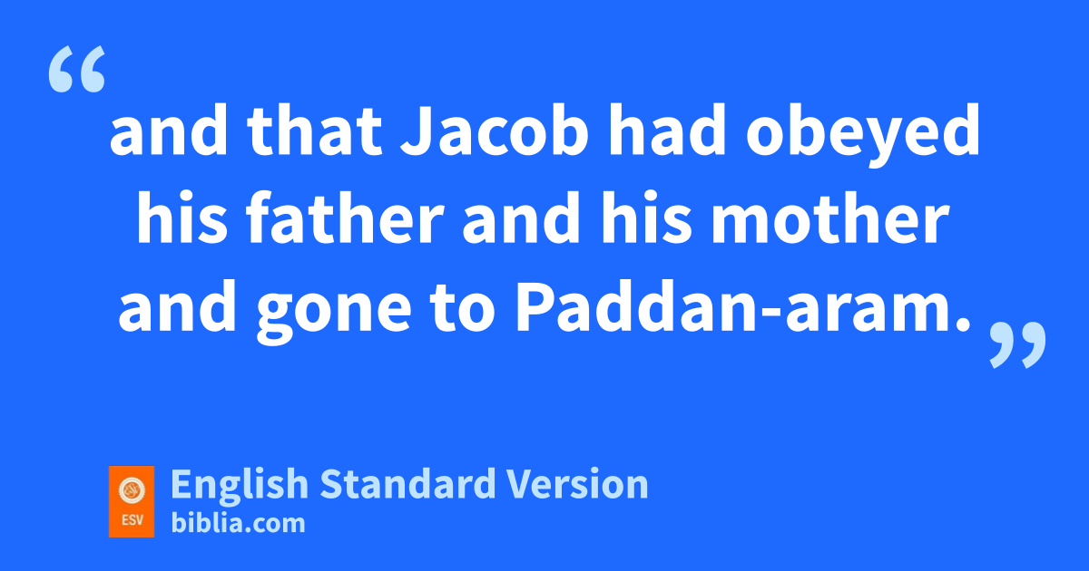 28 Then Isaac called Jacob gand blessed him and directed him, f“You must not take a wife from the Canaanite women. 2 hArise, go to Paddan-aram to the house of iBethuel your mother’s father, and take as your wife from there one of the daughters of Laban your mother’s brother. 3 jGod Almighty1 bless you and make you fruitful and multiply you, that you may become a company of peoples. 4 May he give kthe blessing of Abraham to you and to your offspring with you, that you may take possession of lthe land of your sojournings that God gave to Abraham!” 5 Thus Isaac sent Jacob away. And he went to Paddan-aram, to Laban, the son of Bethuel the Aramean, the brother of Rebekah, Jacob’s and Esau’s mother.