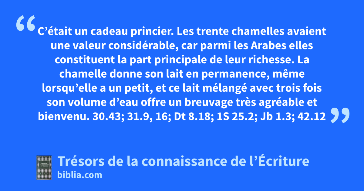 C’était un cadeau princier. Les trente chamelles avaient une valeur considérable, car parmi les Arabes elles constituent la part principale de leur richesse. La chamelle donne son lait en permanence, même lorsqu’elle a un petit, et ce lait mélangé avec trois fois son volume d’eau offre un breuvage très agréable et bienvenu. 30.43; 31.9, 16; Dt 8.18; 1S 25.2; Jb 1.3; 42.12
